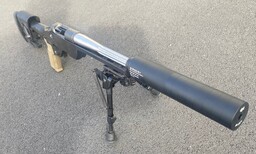 Remington Model 7 in 8.6 blackout, 8 flutes on a 12,5 ‘’, custom Mini overbarrel suppressor in .338 with 7 baffles.