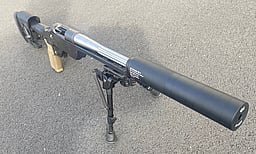 Remington Model 7 in 8.6 blackout, 8 flutes on a 12,5 ‘’, custom Mini overbarrel suppressor in .338 with 7 baffles.